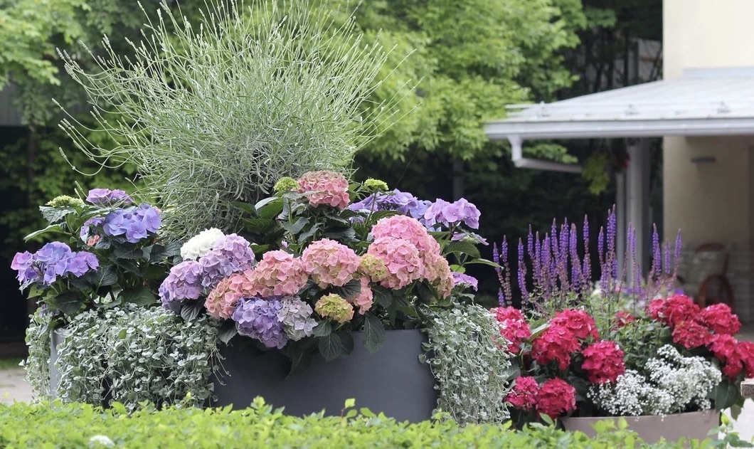 Начну со всеми любимых гортензий (Hydrangea). Благодаря работе селекционеров всего мира выведено достаточно много сортов гортензий метельчатых и крупнолистных, которые украсят любую контейнерную композицию.