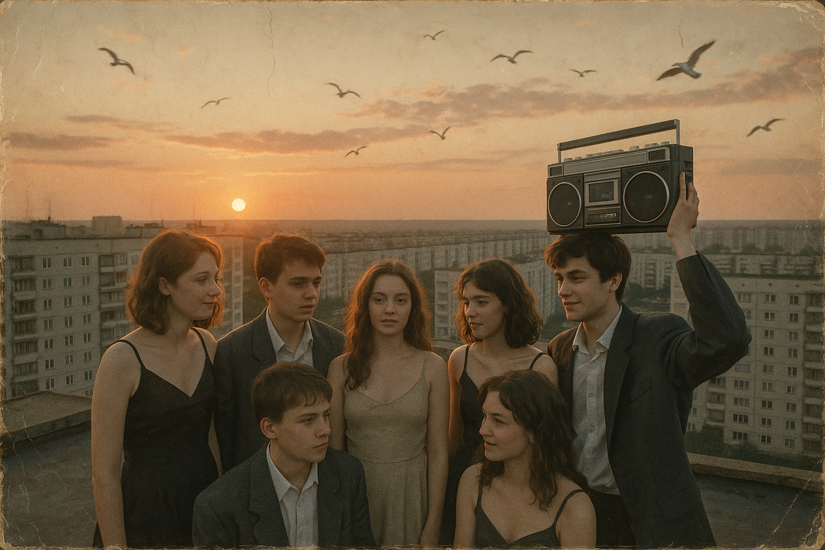 История одного заказа: "Выпускной с видом на панельки" 🎓🕺 Алиса прислала старую, слегка потёртую фотографию. На ней — группа подростков на крыше пятиэтажки. Девушки в вечерних платьях, парни в пиджаках, не по размеру. За спиной — закат, ряды панелек, над ними плывут чайки, а в руке одного из парней — старая, но в то время так казавшаяся крутой, магнитола, играющая «Руки Вверх». «Это наш выпускной, — написала Алиса. — Не в ресторане и не на катере. А на крыше, с чипсами, лимонадом и разговорами до рассвета. Я хочу, чтобы вы нарисовали это так, как я это помню. Не как было — а как чувствовалось». Она выбрала стиль — иллюстрация с лёгким неоном и пыльной мягкой текстурой VHS, чтобы всё выглядело будто кадр из старого фильма. Художник добавил детали: растянутую ленту на ограждении, бутоньерку, приколотую на скотч, туфли, снятые и забытые у люка, и те самые окна, за которыми зажигались огоньки: "вот они — наши зрители, взрослые, которые не мешают". На картине каждый смотрит в разную сторо