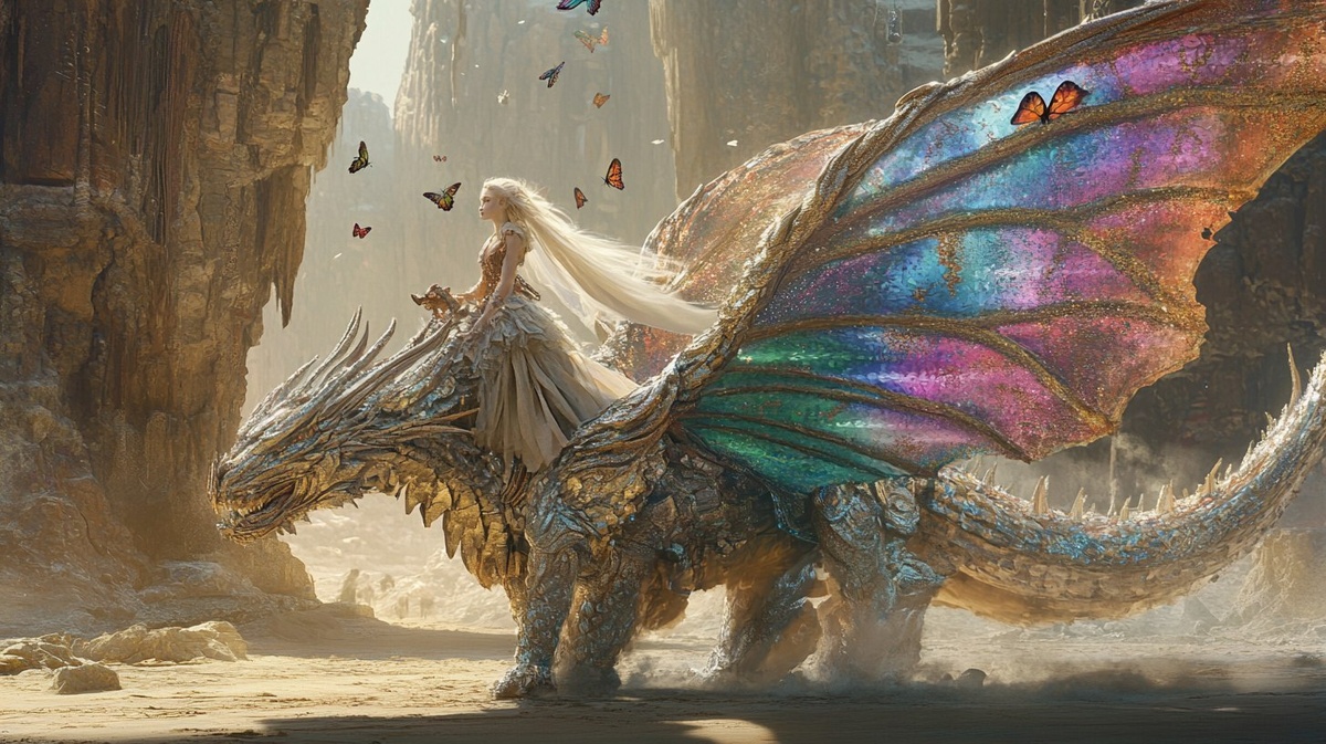 Создано на основе запроса: a fantasy scene of a fairy riding a colorful dragon with butterfly wings in an enchanted desert