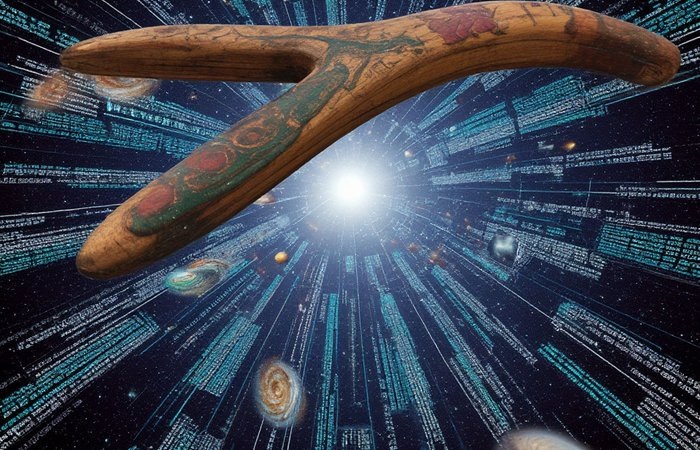 Бумеранг — это то, что мы создаём своим разумом и действиями (ум), под влиянием высшего замысла (Бог), возвращается к нам (мне), наполненым энергией света(Ра) и жизненной энергией (анх/анг) — как воздаяние или урок.