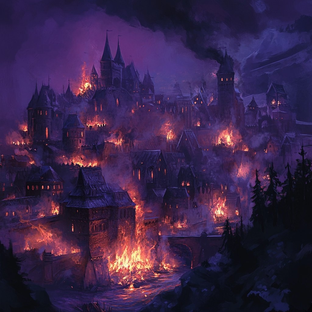 Создано на основе запроса: a rich medieval city burning in violet flames