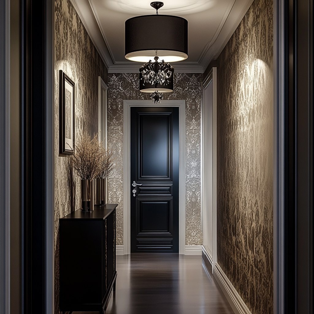 Создано на основе запроса: Stylish hallway interior with dim lighting, retro decor, black and opal matt batten fix ceiling light as the main