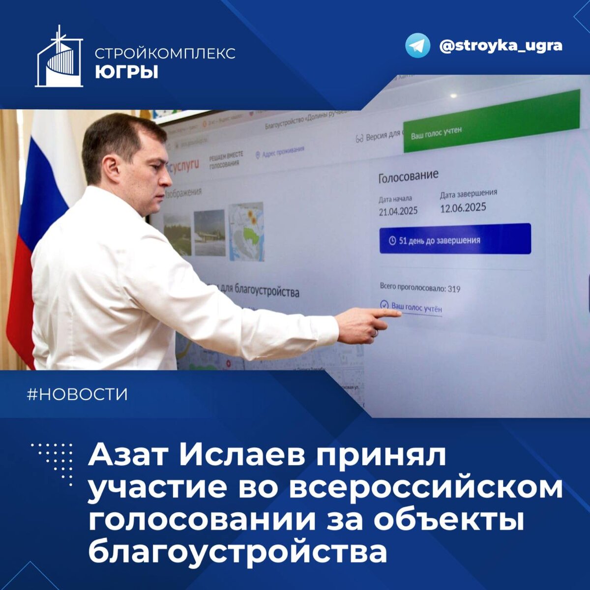 Азат Ислаев принял участие во всероссийском голосовании за объекты благоустройства 👥 Заместитель губернатора Югры Азат Ислаев рассказал на личной страничке во ВКонтакте о своём участии в голосовании в рамках федерального проекта «Формирование комфортной городской среды». «Определиться с выбором было непросто. Ханты-Мансийск выдвинул на голосование сразу 8 проектов. Решил отдать свой голос за благоустройство "Долины ручьёв" в природном парке Самаровский Чугас», - написал Ислаев, призвав югорчан активнее участвовать в голосовании. 💬 Напомним, всего в этом году для голосования представлены 52 общественных пространства в 15 муниципалитетах Югры. Участвовать в выборе могут все, кому исполнилось 14 лет. На момент написания этого поста на платформе уже проголосовали более 25 тысяч человек. Проголосовать можно до 12 июня — Дня России на платформе zagorodsreda.gosuslugi.ru #Новости #ФКГС #ГородаМеняютсяДляНас #Благоустройство #АзатИслаев #СтройкомплексЮгры