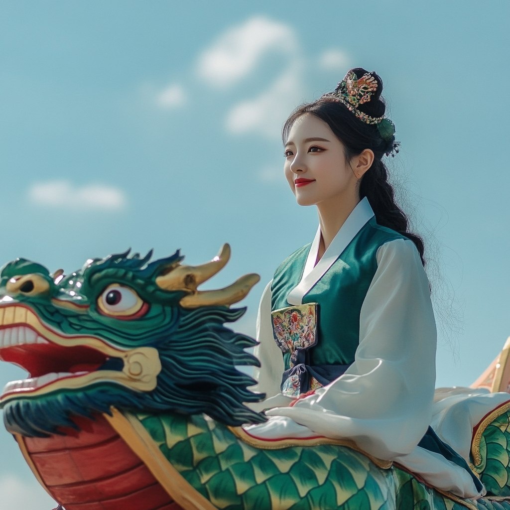 Создано на основе запроса: A Modern fashion sense stylish Korean Lady sitting on a dragon boat during the Dragon Boat Festival, with a blue