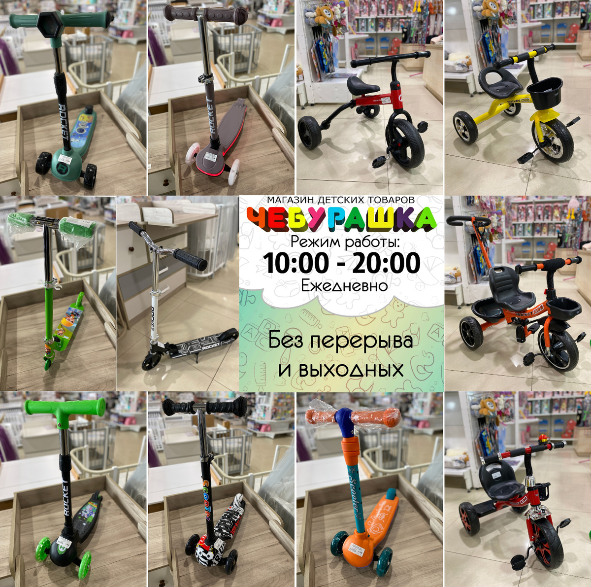 В наличии большой выбор трехколёсных велосипедов, самокатов и беговелов в магазине детских товаров "Чебурашка" ТЦ "Мандарин", 2 этаж
