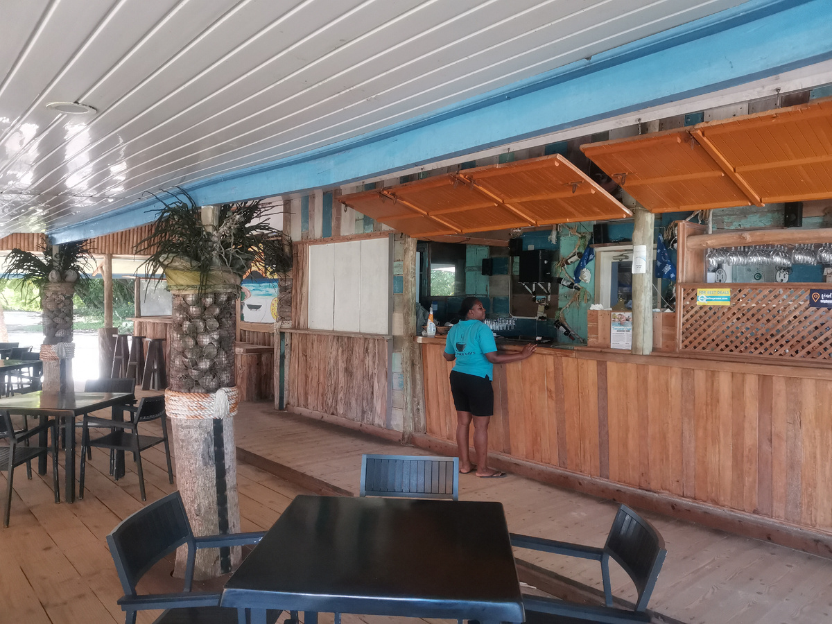После осмотра колониального поместья Ла-Юнион мы остановились пообедать в кафе Old Pier («Старый пирс»), расположенном на набережной рядом с красивым старым пирсом. Кафе Old Pier – это пляжное кафе с сидячими местами на свежем воздухе под навесом. Интерьер заведения очень незамысловатый. Место у барной стойки декорировано деревом, колонны оформлены сеткой с половинками скорлупы кокосовых орехов. Есть своя фишка: ближе к морю установлен стол, на которая выставлена «батарея спиртных напитков». Конечно, содержимое в них уже не настоящее, но выглядит зачетно! В меню Old Pierre Café представлены различные блюда на гриле, приготовленные по местным рецептам, и у посетителей есть возможность выбрать дополнения и соусы к каждому блюду. Среди предлагаемых блюд – говяжьи ребрышки на гриле, тилапия на гриле, бургеры и многое другое. В меню кафе есть множество вегетарианских блюд, а также полезные блюда для тех, кто придерживается диеты. В кафе ежедневно меняется меню на доске объявлений: от домашн
