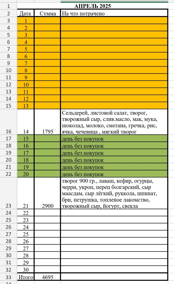 Приветствую подписчиков и гостей канала! Вторая половина апреля у меня расхламление морозилок и устранение ненужных трат через сокращение походов магазин и использование запасов. Решила ходить в магазин один раз в неделю и пока мне это удаётся. Круп в запасах много, мясо-куриное тоже в морозилке имеется, рыба заканчивается. На следующей неделе буду запасы рыбы пополнять. Возможно заготовку курицы сделаю, но не точно. Хочу большую морозилку освободить полностью, отключить и помыть. По расходам и покупкам данные в таблице👇. Основные траты на овощи, зелень, молочку. В этом мы себе не отказываем. В общем, я пока довольна тем, что запасы подчищаются, расходов гораздо меньше. Буду действовать в том же направлении. Благодарю за 👍 и комментарии!