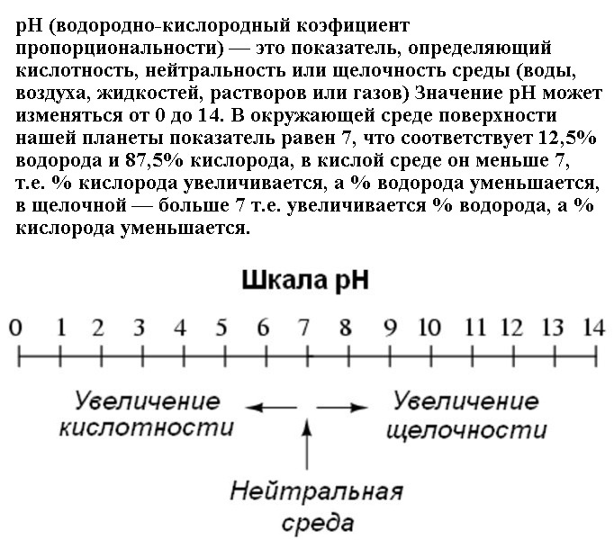 pH (водородно-кислородный коэфициент пропорциональности) — это показатель, определяющий кислотность, нейтральность или щелочность среды (воды, воздуха, жидкостей, растворов или газов) Значение pH может изменяться от 0 до 14. В окружающей среде поверхности нашей планеты показатель равен 7, что соответствует 12,5% водорода и 87,5% кислорода, в кислой среде он меньше 7, т.е. % кислорода увеличивается, а % водорода уменьшается, в щелочной — больше 7 т.е. увеличивается % водорода, а % кислорода уменьшается. В нормальных условиях поверхности этой планеты пропорция составляет 12,5% водорода и 87,5 % кислорода, она же формула Н2О. В процессе электролиза с двумя банками данная пропорция меняется, в одной банке становится больше водорода, она же живая вода, она же легкая вода, она же щелочь с Рh больше 7, по цвету белая как молоко, а белый осадок сухой водород, похож на соду. В другой банке наоборот кислорода становится больше, она же мертвая вода, по цвету желтая, она же тяжелая вода, кислота и