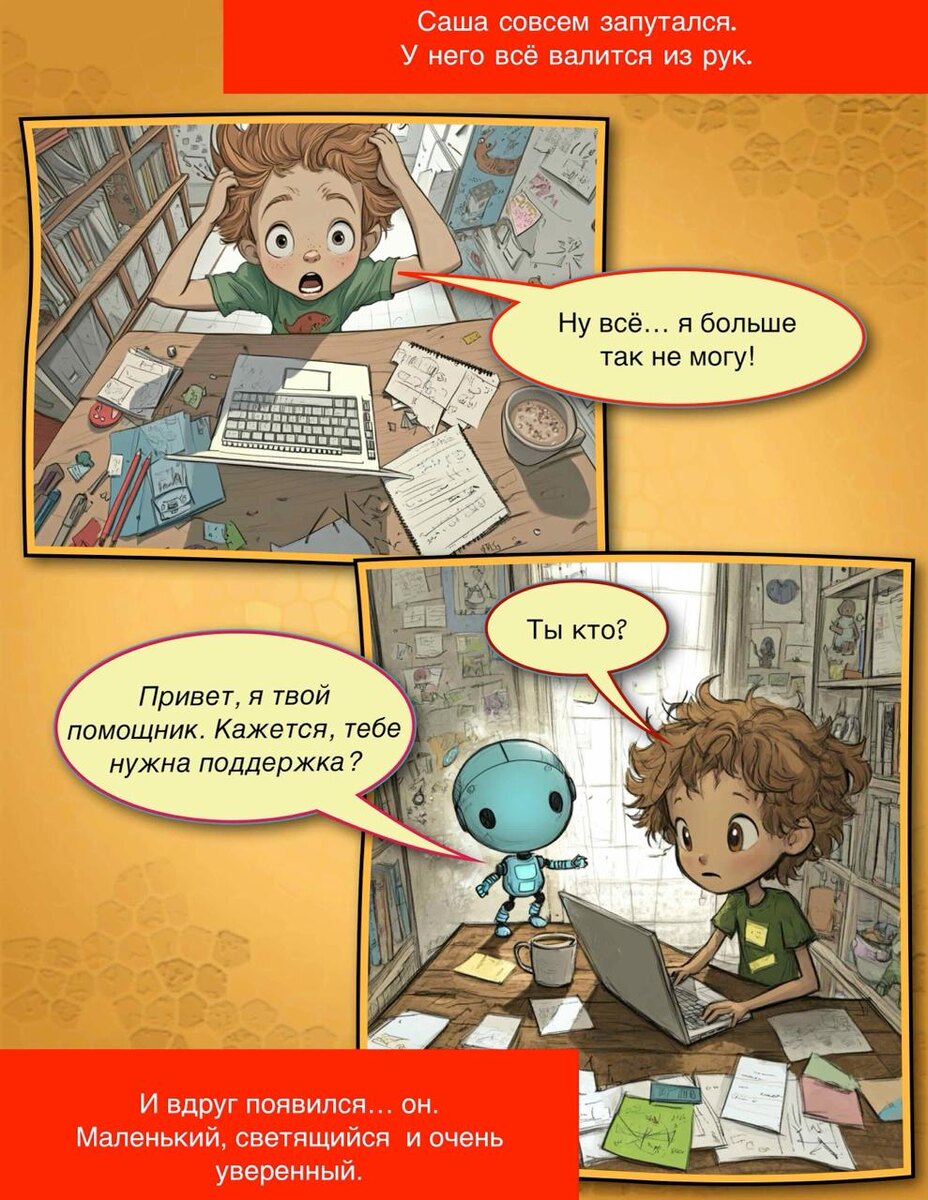 Это простой комикс на 90% был создан с помощью ИИ. Что делали ИИ, а что человек? 1. Человек создал урок большого курса по ИИ Агентам, потом загрузил несколько тезисов в chayGPT. 2. Потом я попросил на базе загруженного документы накидать сценарий с надписями на кадрах + репликами героев + промпты для подходящих картинок. Ни одной надписи и реплики мы не редактировали. 3. Потом Midjourney создал по этим промптам картинки и автор (я) и chatGPT оценивали, насколько картинка отвечает требованиям режиссуры и консистентности. Некоторые картинки получились с 1-ого раза, некоторые с 3-его. Моя задача сводилась к загрузке промптов, оценки и коррекции результатов. 4. Затем Tatiana Tkr все смонтировала в Coimic Life 3, и я немного подправил финальный макет. На создание комикса на основе урока в сумму ушло где-то 1,5 часа, из которого 30 минут генерация картинок по брифу и примерно 40 минут верстка макета, так по мелочи. Все это стоило нам 0 денег и тонну удовольствия от осознания того, что н