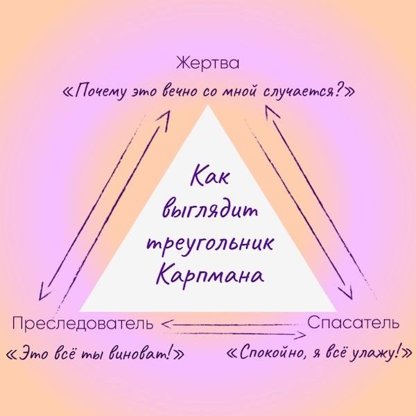 Разбираемся с треугольником Карпмана Зачастую мы неосознанно разыгрываем один и тот же психологический сценарий — в семье, на работе, в дружбе. Иногда мы спасаем, иногда нападаем, иногда чувствуем себя беспомощной жертвой. И всё это — неслучайно. Добро пожаловать в треугольник Карпмана — модель, которая объясняет, почему мы так часто запутываемся в отношениях. Осознание этой динамики может стать первым шагом к выходу из неё. Стивен Карпман, психиатр и драматург (да, в прямом смысле), предложил эту модель в 1968 году. Она описывает три основные роли, которые люди бессознательно занимают в конфликтных и эмоционально заряженных взаимодействиях: Жертва — «Я бедный/бедная, со мной всё плохо, меня не понимают, мир против меня». Преследователь — «Ты сам виноват, как ты мог, я сейчас всё объясню!» Спасатель — «Сейчас я всё решу за тебя, тебе просто нужно…» Мы можем «переключаться» между этими ролями за секунды. Например, вы сначала спасаете коллегу, который не справляется, потом злитесь, что