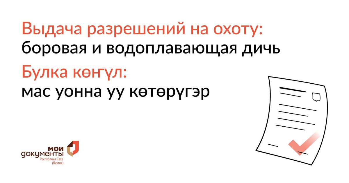 Выдача разрешения на добычу водоплавающей и боровой дичи для осуществления охоты на общедоступных угодьях общего пользования РС(Я)✅ 📊Название услуги: Выдача разрешений на добычу охотничьих ресурсов, за исключением охотничьих ресурсов, находящихся на особо охраняемых природных территориях федерального значения, а также млекопитающих и птиц, занесенных в Красную книгу Российской Федерации ℹ️Внимание: заявления принимаются до 10 июня 2025 года. 📄Необходимые документы: ➡️Паспорт РФ ➡️Охотничий билет ➡️Квитанция об оплате пошлины (650 рублей на каждый район, где планируется охота) и квитанция об оплате сбора (сумма сбора зависит от количества заявленных объектов охоты) 📍Места предоставления услуги: ➡️В офисах центра "Мои Документы" ➡️В Министерстве экологии, природопользования и лесного хозяйства РС(Я) 🌐Е-Якутия: https://e-yakutia.ru/#/service/1400000000160255394/info ——— Саха Сирин бултуур уопсай учаастактарыгар мас уонна уу көтөрүн бултуурга көҥүл ылыы✅ 📊Өҥө аата: Выдача