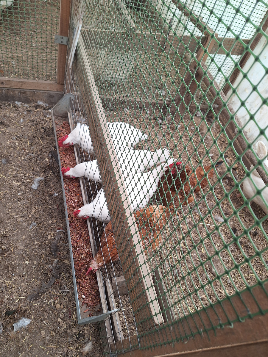 Сегодня решила маленько курочек своих разделить. Мои белые куры, их четыре штуки, породы Ленинградская белая, как-то ведут себя странно. Необщительные, по вечерам, когда все ещё гуляют, они уже сидят на сидалах. Петухов к себе не подпускают. Конечно бывает какой-нибудь петух исподтишка все-же умудриться их поймать, но добровольно они не даются. Решила посадить их отдельно, посмотреть, может их уже пора на лапшу, всё таки они уже не первой свежести. И главное курочки-то красивые, всегда чистые, даже не вижу, когда они линяют, перо всегда гладкое, и от петухов залысин нет. Да и размер у них очень приличный, ходят важно, самые крупные в моём стаде. К ним ещё добавила двух рыжих, их я проверила, они явно не несутся, расстоянние между лоннными косточками очень маленькое, вообще только с один палец. Они тоже уже старенькие. Пришлось добавить ещё одну черную, заметила, что у неё что-то с ногой. До этого не замечала. Теперь буду смотреть, будет ли от этих моих 7 курочек яйцо. Если не будет, то
