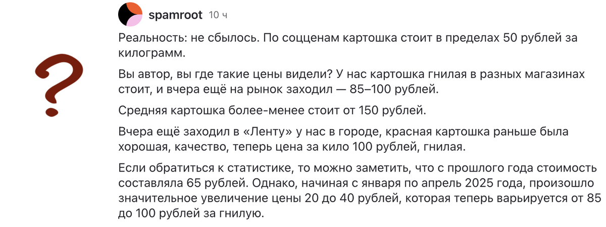 Честное слово, я не радуюсь, что мой прогноз сбылся, хоть и с опозданием на полтора месяца. Если бы доходы росли так же быстро, как цены на картошку, я был бы доволен. Но у меня они падают, а людям с зарплатами 25-30 тысяч рублей радоваться в магазинах нечему. Что 80 рублей, что 300 — все равно дорого.