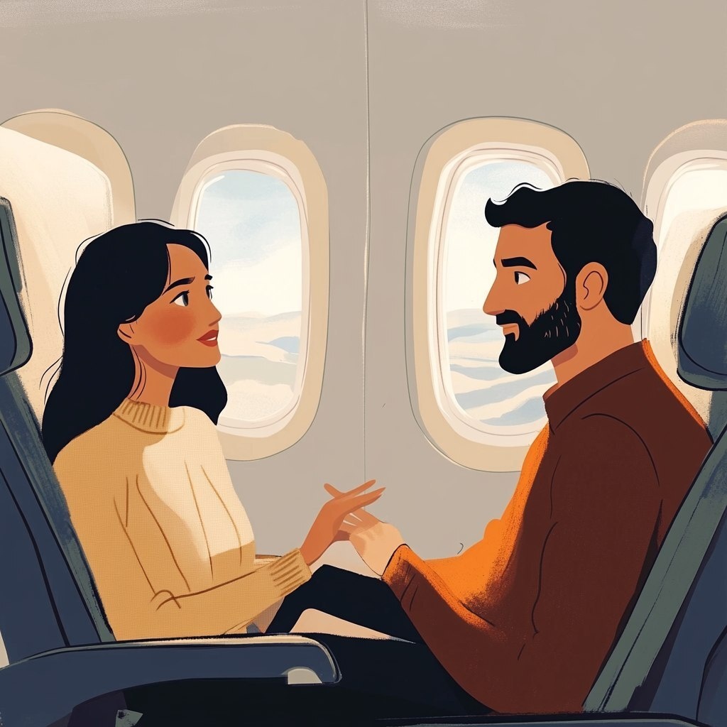 Создано на основе запроса: a man and woman sitting next to each other on a plane talking to each other