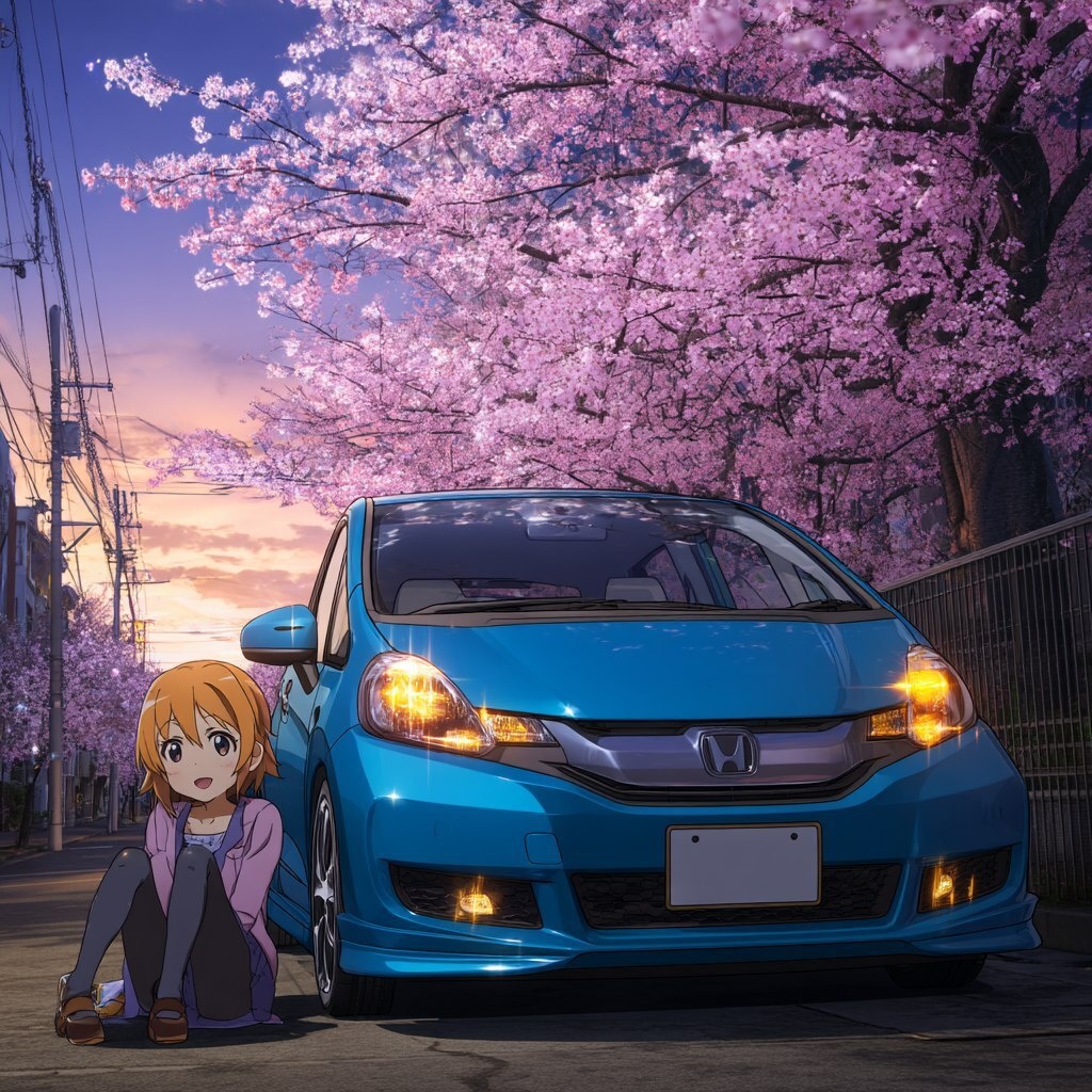 Создано на основе запроса: HONDA FIT GE8 Body color Blue Full bod front view Cel anime color Kyoto animation Chibi anime cute little girl