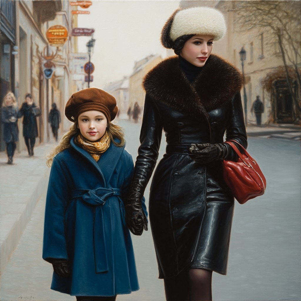 Создано на основе запроса: A painting of an elegant woman in a black leather dress, long leather gloves and white fur hat walking with her daughter on the street, a full-body portrait. The woman wears a fur coat, while the little girl is wearing a blue woolen overcoat, a brown beret, and a scarf around her neck. The painting is in the style of Alex Alemany. --- Автоперевод: Картина элегантной женщины в черном кожаном платье, длинных кожаных перчатках и белой меховой шляпы, прогуливаясь с дочерью на улице, портрет всего тела. Хорошо получилось? 🤔 https://dzen.ru/id/65c0c65c86e4f837c27b24d7 #ИИ #AI #нейросеть #midjourney #art