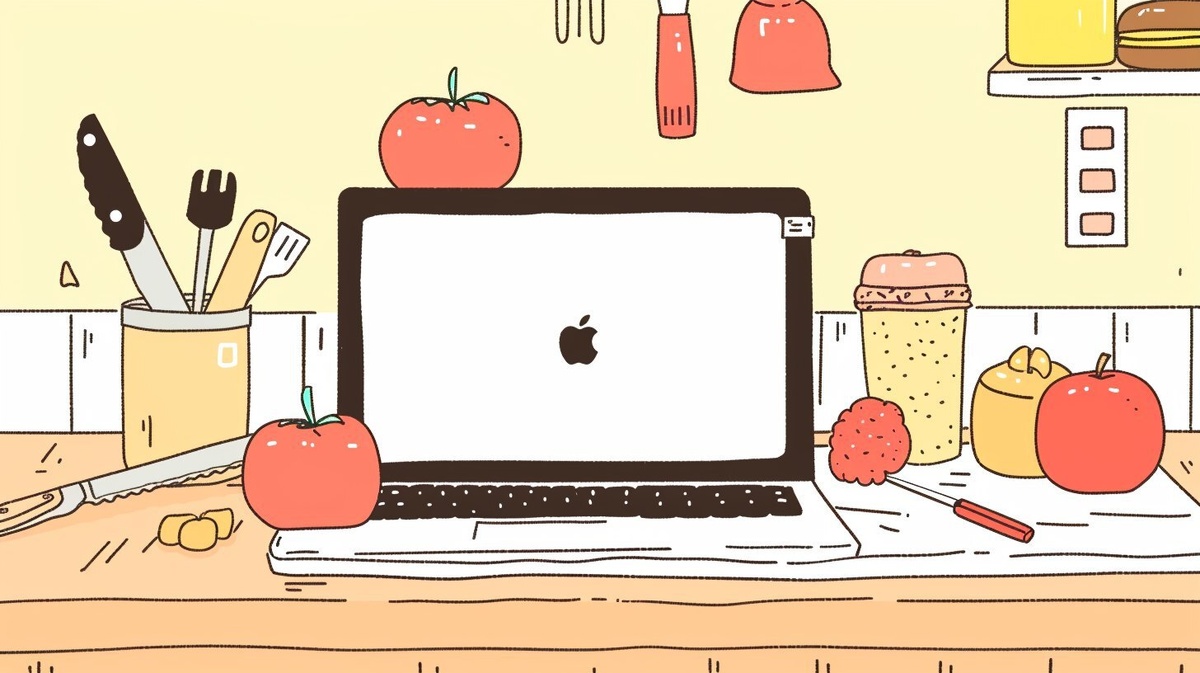 Создано на основе запроса: modern illustration of a laptop on a chopping board with bakery tools