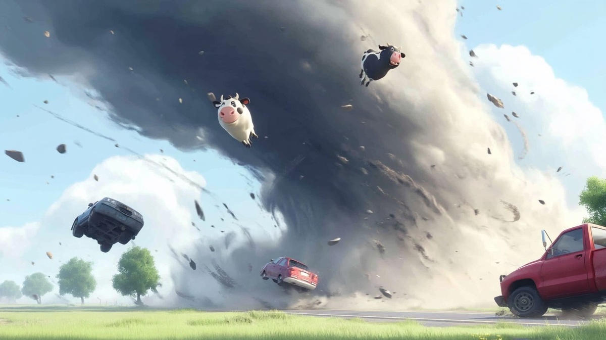 Создано на основе запроса: a surreal 3D cinematic scene , inspired by the Twister movie poster, rendered in Unreal Engine style a massive, violent tornado spiraling across a rural landscape a cow, a red pickup truck, and a silver car are all fully airborne, floating unnaturally, completely suspended in mid-air, defying gravity, visibly pulled into the vortex none of them are touching the ground the tornado is chaotic and dramatic, with swirling debris, motion blur, dust trails, and stylized storm clouds, --- Автоперевод: Сюрреалистическая трехмерная кинематографическая сцена, вдохновленная плакатом фильма Twister, представленная в нереальном стиле двигателя массивным, насильственным торнадо, прописывающимся по сельскому ландшафту корову, красный пикап и серебряный автомобиль полностью в воздухе, плавающие неестественно, полностью подвешенные в воздухе, явно втянутые в общенациональный, и явно-то, что не касается, и тр. Красиво выглядит? 🤔 https://dzen.ru/id/65c0c65c86e4f837c27b24d7