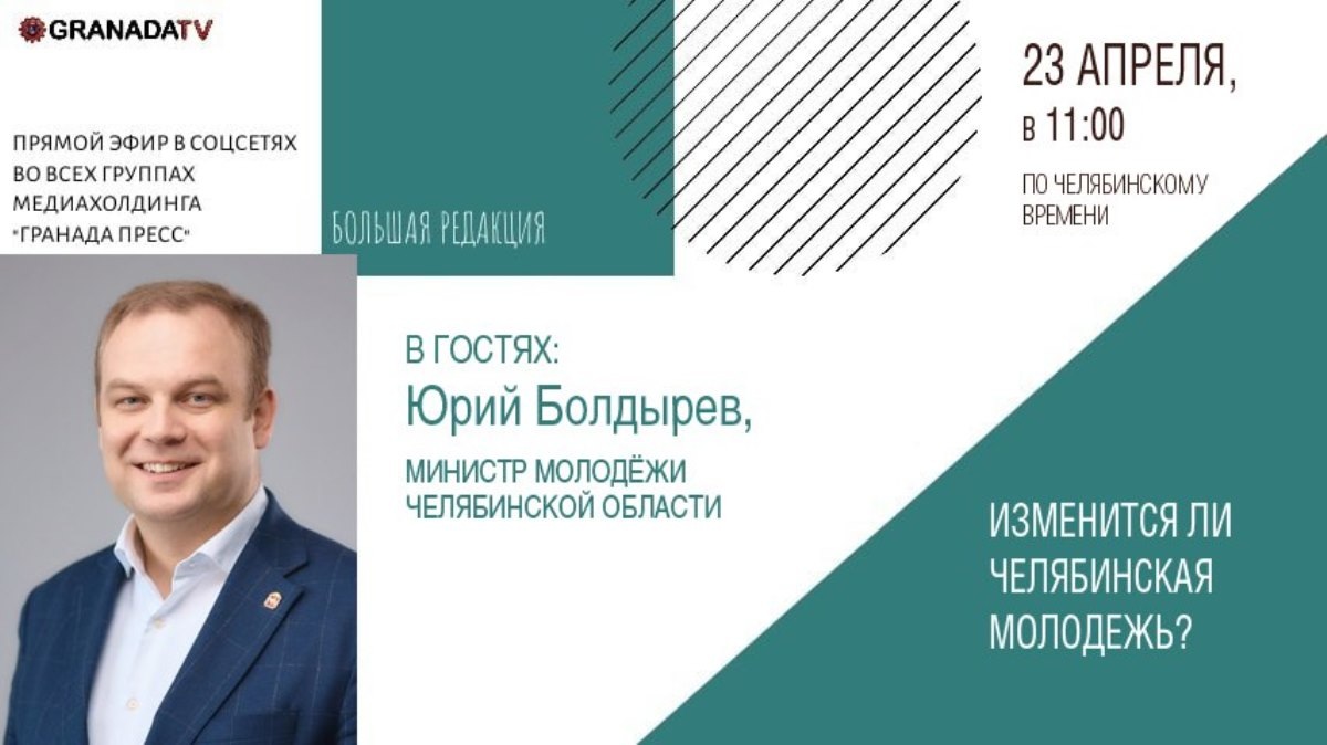 Глава министерства молодежи расскажет про флагманский образовательный проект «Друг с Южного Урала», а также про другие важные молодежные проекты Челябинской области, а также про самые интересные мероприятия, на которые будет богато это лето. Также беседа с Юрием Болдыревым пойдет и про грантовые конкурсы, в которых молодые южноуральцы проявляют завидную активность. Можно будет узнать, какие конкурсы есть и какие возможности они открывают перед участниками. Трансляция «Большой редакции» с Юрием Болдыревым будет доступна на странице «Гранада ТВ» во ВКонтакте. Там же в комментариях, или в комментариях непосредственно под видео, можно оставить свои вопросы, чтобы их задали во время прямого эфира. В беседе с министром также примут участие журналисты изданий медиахолдинга «Гранада Пресс».