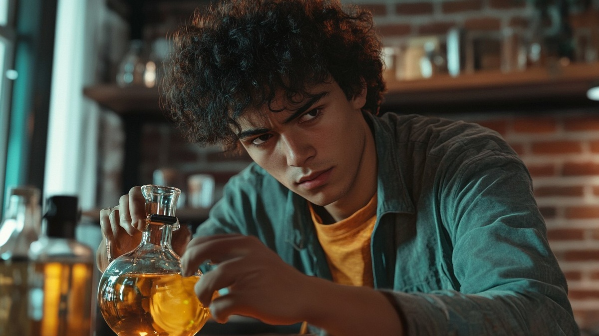 Создано на основе запроса: A young Latino Man with curly hair pouring golden liquid into his alchemy set