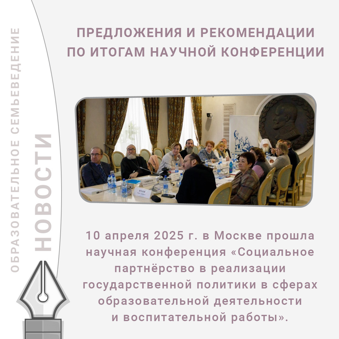 10 апреля 2025 г. в Москве прошла научная конференция «Социальное партнёрство в реализации государственной политики в сферах образовательной деятельности и воспитательной работы», организованная Комиссией Общественной палаты РФ по вопросам социального партнёрства, попечения и развитию инклюзивных практики при поддержке Фонда по премиям памяти митрополита Московского и Коломенского Макария (Булгакова) и при участии Международной общественной организации «Союз православных женщин», Патриаршей комиссии по вопросам семьи, защиты материнства и детства, Автономной некоммерческой организации «Сообщество практиков образовательного семьеведения», Издательского дома «Народное образование».