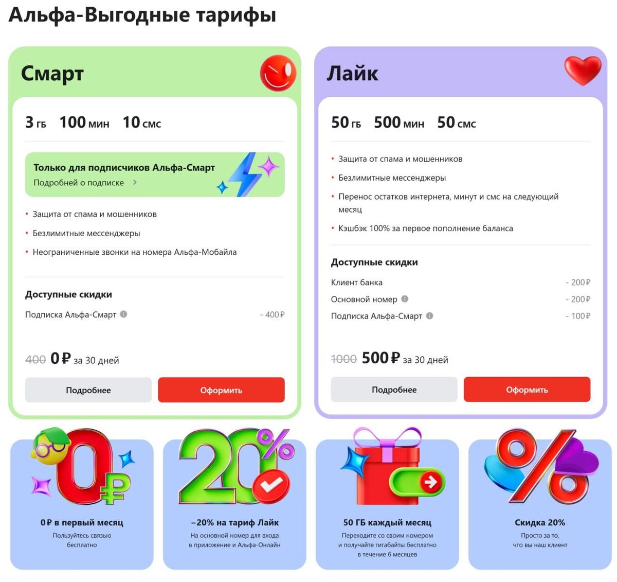 💳 Альфа-Мобайл стартовал: почти бесплатная связь уже доступна ⚡️ Виртуальный оператор Альфа-Мобайл представил тарифы. Оформить SIM или eSIM можно в Москве и МО, Санкт-Петербурге и ЛО, а также в Челябинской и Новосибирской областях. 📱 Доступны два тарифа: 1️⃣ Смарт — 400 ₽/мес ▫️ 3 ГБ, 100 мин, 10 SMS ▫️ Бесплатно при подписке на «Альфа-Смарт» (скидка 400 ₽) 2️⃣ Лайк — 1 000 ₽/мес ▫️ 50 ГБ, 500 мин, 50 SMS ▫️ От 500 ₽/мес с максимальными скидками: — 100 ₽ за «Альфа-Смарт» — 200 ₽ для клиентов банка — 200 ₽, если номер основной в банке 🎁 Бонус: при переносе номера — дополнительно +50 ГБ/мес на 6 месяцев 🔐 Включено в оба тарифа: ✅ защита от спама ✅ безлимит в мессенджерах ✅ бесплатные звонки внутри сети ✅ для «Лайк» — перенос остатков и 100% кешбэк на первое пополнение 📌 Примечание: — расчётный месяц — 30 дней — посуточный вариант менее выгоден — в ряде регионов действует отдельная тарификация (Крым, ДНР, ЛНР и др.) 🔗 [Страница оператора] | [Карта покрытия] ❓Как вам тарифы?