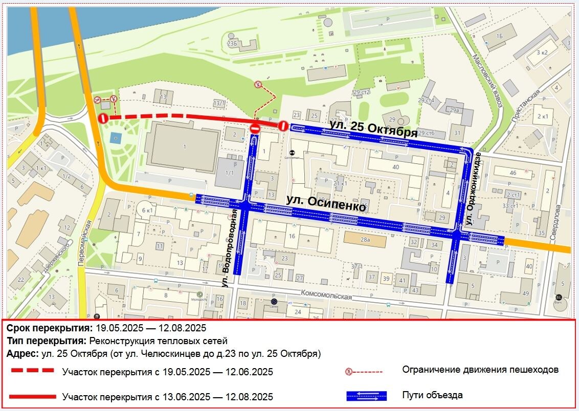 Информационное сообщение В связи с выполнением работ по реконструкции участка трубопровода тепловых сетей по улице 25-го Октября планируется прекращение движения транспорта на следующих участках автомобильной дороги: - в районе здания по ул. Осипенко, 1, - в период с 19.05.2025 по 12.06.2025; - от здания по ул. Осипенко, 1, до здания по ул. 25-го Октября, 23, - в период с 13.06.2025 по 12.08.2025. Всем участникам дорожного движения рекомендуем заранее планировать маршрут, обращать внимание на дорожные знаки, соблюдать Правила дорожного движения РФ. Схемы объезда: ул. Осипенко, ул. Орджоникидзе, ул. Водопроводная. Департамент дорожной инфраструктуры и транспорта