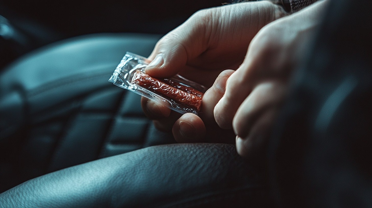 Создано на основе запроса: An extreme close-up of a hand opening a pack of salami sticks on a car seat or armrest