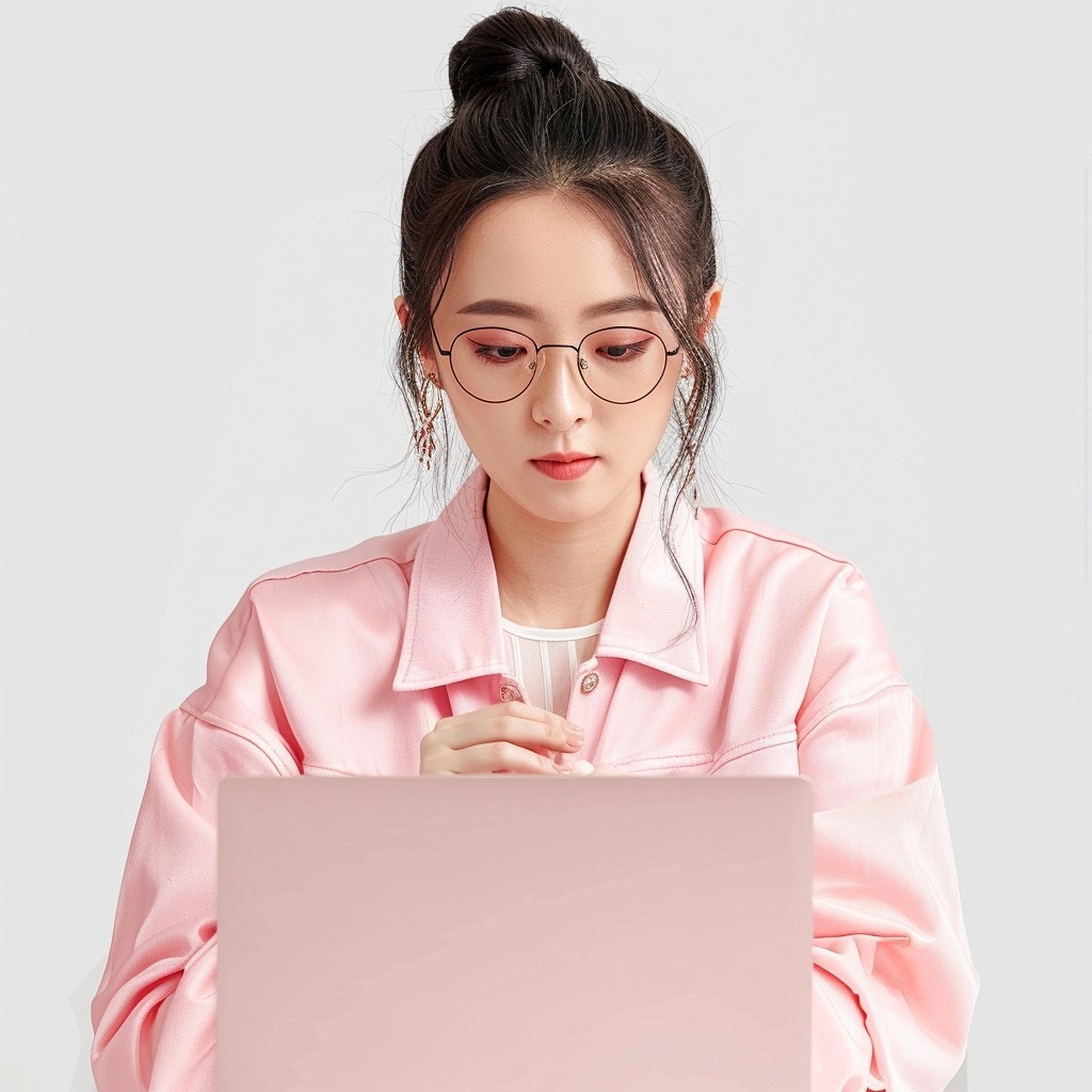 Создано на основе запроса: smart asian woman digital model grab a computer, white background, pink fashion style