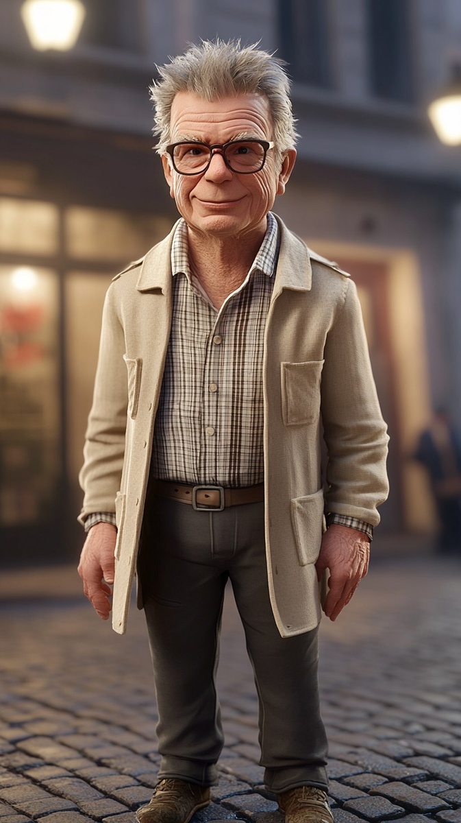 Создано на основе запроса: A stylized 3D character of an elderly man in a warm, urban setting. He has a friendly, wise face with glasses. He wears a layered outfit: a beige cardigan, a plaid shirt, and a brown leather trench coat. He also wears sturdy brown boots. The background is a softly blurred cobblestone street with warm street lights. Pixar-style proportions with detailed textures, realistic lighting, and soft shadows. Cinematic depth of field. Rendered in ultra-realistic 3D cartoon style. --- Автоперевод: Стилизованный 3D -персонаж пожилого человека в теплом городском обстановке. Как тебе иллюстрация? 🤔 https://dzen.ru/id/65c0c65c86e4f837c27b24d7 #ИИ #AI #нейросеть #midjourney #art