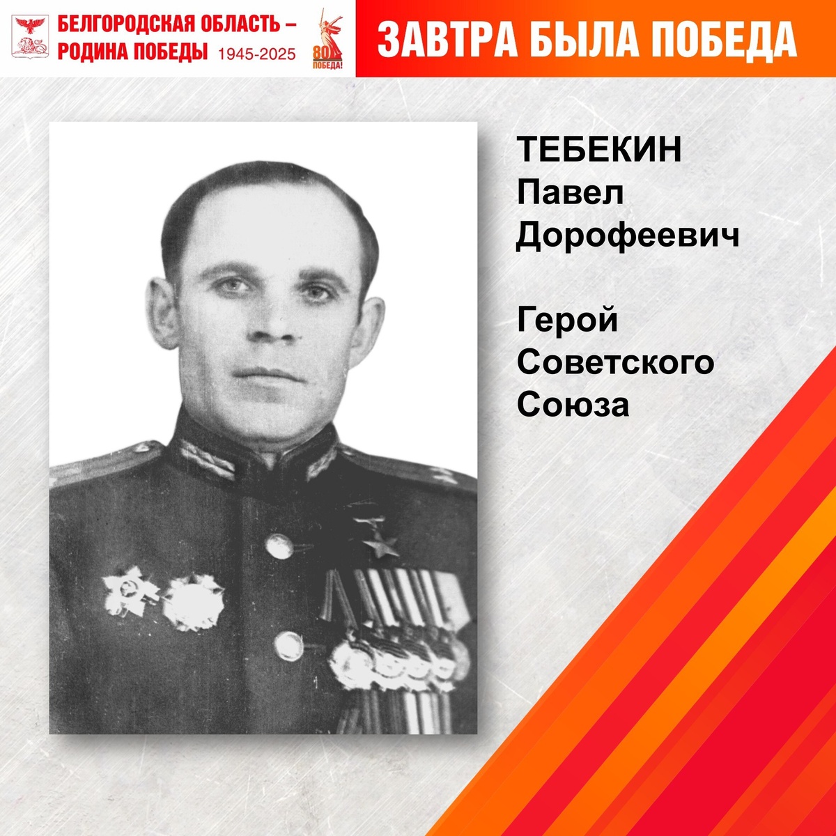 #Завтра_была_Победа #Победа80 23 апреля 1945 года Указом Президиума Верховного Совета СССР Тебекину Павлу Дорофеевичу (05.11.1917 – 27.02.1980) присвоено звание Героя Советского Союза. На фронте с первых дней Великой Отечественной войны. 29 июля 1944 года стрелковый батальон 629-го стрелкового полка (134-я стрелковая дивизия, 69-я армия, 1-й Белорусский фронт), командиром которого был Тебекин Павел Дорофеевич, 29 июня 1944 года первым форсировал Вислу в районе населённого пункта Люцимя под городом Пулавы и отразил несколько контратак противника. В бою за расширение плацдарма 2 августа 1944 года батальон, сломив сопротивление гитлеровцев, овладел важной высотой и вышел на окраину населённого пункта Шляхетски Ляс. Награждён орденами Красного Знамени, Александра Невского, Отечественной войны 2-й ст., 6 медалями. #БГИКМ #музей