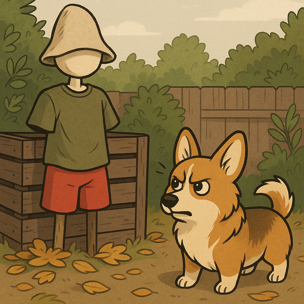 Примерно за час у меня вышло нечто: торс — из пеноплекса, на голове — шапка для парилки (куда её ещё девать?), красные папины шорты — по колено, а сверху — его старая футболка . Сам он её ненавидел, но выкинуть не давал — "вдруг пригодится". Вот она, судьба этой футболки — пугать ворон. Или хотя бы вдохновить Лану на подвиги. Я поставила творение рядом с ящиком у компостной ямы, прикрыла на вечер, чтобы папа завтра прикрутил к палке. Лана в это время спала на веранде, свернувшись клубочком, как булочка из мультика. И тут началось. — ГАВ! — выстрел прозвучал так резко
