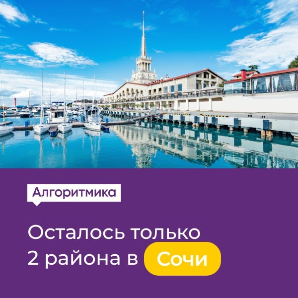 В нашем новом блоге на Бизнес-секретах рассказали, почему образовательный бизнес в Сочи – это выгодно и перспективно. Читайте по ссылке 🔗 Немного фактов 🖥 В Сочи развита инфраструктура, большой туристический поток, постоянный рост экономики и даже будет построен международный IT-парк – центр притяжения инноваций мирового уровня. А еще 560 тысяч постоянных жителей, среди которых более 120 тысяч детей! 🏫 Качественных детских образовательных центров в Сочи все еще недостаточно. Самое время ворваться на перспективный рынок вместе с Алгоритмикой! 💳 Наш франчайзи-партнер в Сочи обучает до 160 детей ежемесячно со стоимостью абонемента всего 5 000 рублей. Таким образом, выручка школы достигает 800 000 рублей в месяц ❗️В Сочи доступно только 2 района. Запишитесь на разбор франшизы Алгоритмика сейчас и забронируйте выгодную территорию первым!