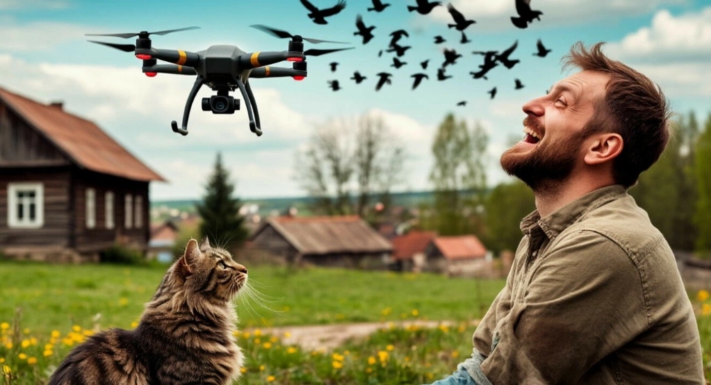 — Ну, Мурлык, встречай будущее! — Федя торжественно водрузил на стол коробку с надписью «SuperFly X5000». Кот Царь, лениво развалившийся на печи, приоткрыл один глаз: — Мр-р-р? (что в переводе с кошачьего означало: «Опять какую-то ерунду купил?») — Это не ерунда! — возмутился Федя, вытаскивая из коробки блестящий квадрокоптер. — Это глаз с высоты! Военная разведка! Нанотехнологии! Кот потянулся, зевнул и демонстративно отвернулся, давая понять, что нанотехнологии его не впечатляют. Федя между тем уже лихорадочно листал инструкцию: — «Зарядить аккумулятор... Привязать учетную запись...» Да ну их, эти заморочки! — махнул он рукой и сунул вилку прямо в розетку. Дрон ожил, замигал разноцветными огоньками и издал бодрый писк, от которого кот Царь шмыгнул под диван. — Видишь, Мурлык? — торжествовал Федя. — Это ж не то что твоих мышей ловить! На улице Федя поставил дрон на крышку колодца и, как положено по инструкции, отошёл на три шага. — Поехали! — нажал он кн