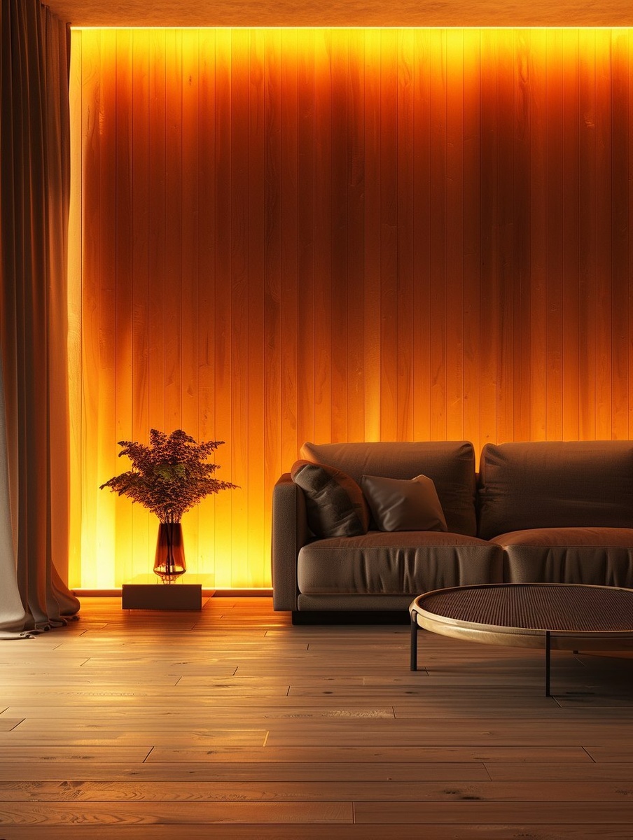 Создано на основе запроса: a wide wooden floor with plenty of empty space in the foreground, perfect for product display, elegant orange iridescent wall with artistic gradients, stylish AI-inspired non-realistic style, cozy modern sofa, small coffee table with flowers on top, warm lighting, high detail, digital art, surreal interior design, dreamy atmosphere