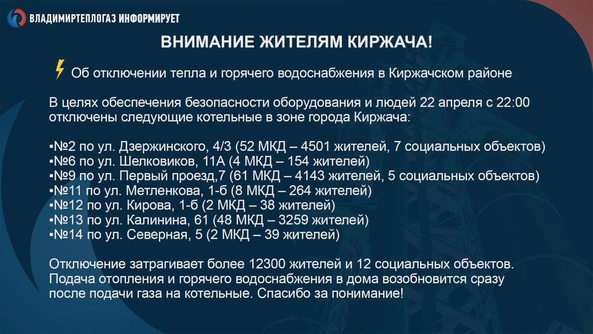 Владимиртеплогаз сообщает об отключении тепла и горячей воды в Киржачском районе В домах свыше 12 тысяч жителей похолодало. Отключили горячую воду и отопление и в 12 социальных объектах. С 22 апреля в районе действует ЧС из-за детонации боеприпасов на складе воинской части.