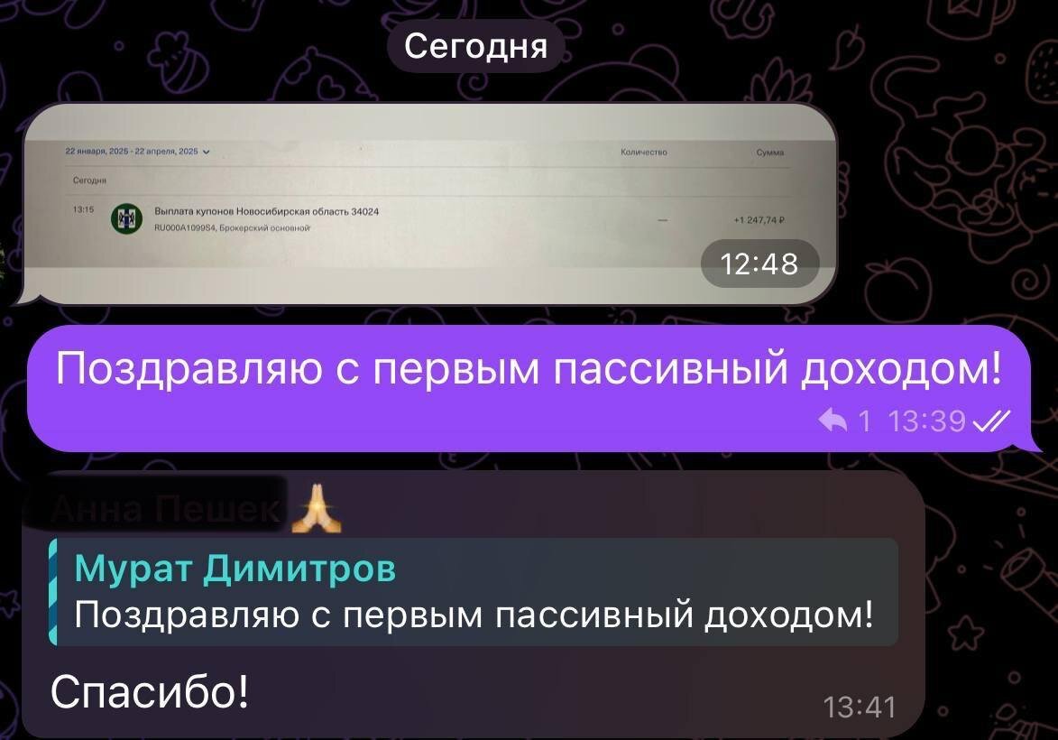 Ученица получила свой первый пассивный доход за 1 месяц 💸 В прошлом месяце проводил 2-х дневный практикум «Фин-база», на котором рассказывал про основы финансовой грамотности, а также как работают фондовый рынок, недвижимость, инвестиции в бизнес и крипта. Основная цель практикума не просто дать теорию, а помочь каждому сделать первые шаги в инвестициях в течение 1-2 месяцев. У кого-то ближайшая цель была накопить 500 000р, а у кого-то получить свои первые 1000р пассивного дохода с минимальной суммой инвестиций. Выше прикрепил скрин ученицы, где она получила первую выплату в размере 1 247р, впустя месяц после практикума. Конечно это небольшой пассивный доход, но зато он есть. Ученица поняла принцип как это работает и опыт, который позволит масштабироваться. Что вы думаете, 1 247р это хороший пассивный доход для начала или не очень? 🔥 - супер 🗿 - мало Ближайший практикум «Фин-база» состоится на этой неделе, 26-27 апреля, после практикума будет 2 месяца поддержки от меня, чтоб