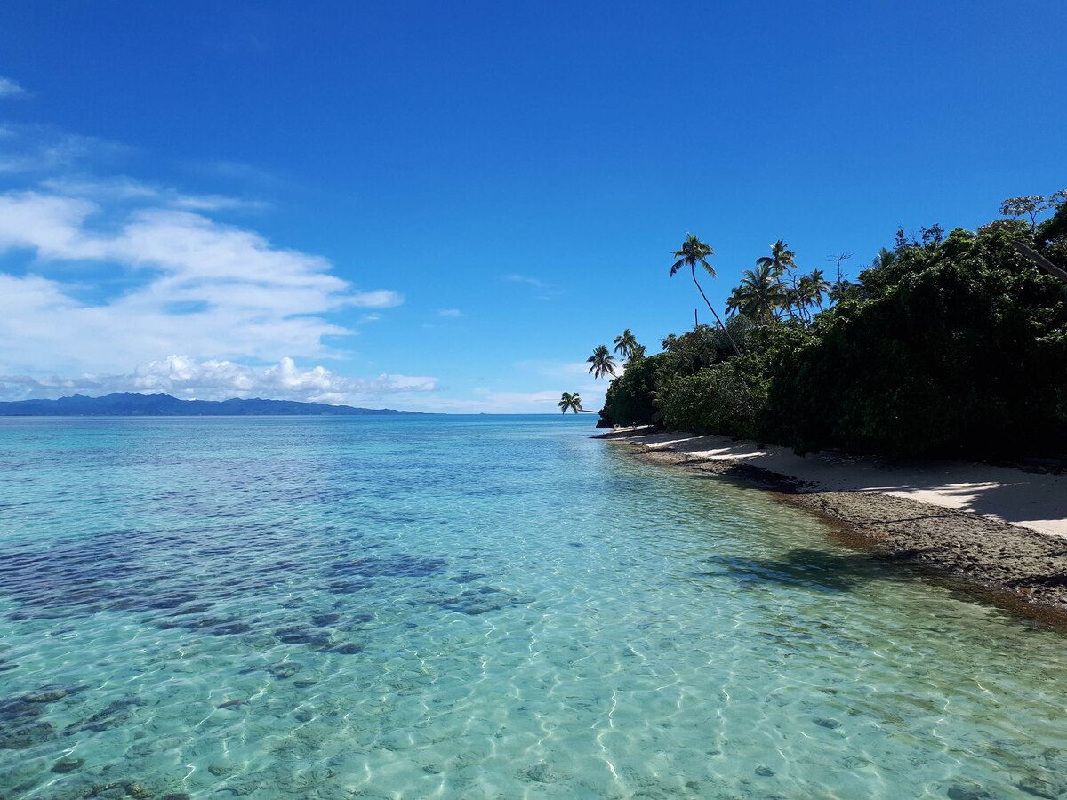 Из цикла воспоминаний о Фиджи. Лелеувия - небольшой коралловый островок в вечно теплом океане. Метров сто в ширину, триста метров в длину. Еще свежи воспоминания людей, что когда-то он был немного больше. Но во время очередного тропического урагана часть его смыло. Тот циклон тогда звали Винстон, это случилось в год мужских ураганов, их вахты чередуются с годами женских. Неудивительно, что смыло, больше впечатляет, что не весь, ведь остров, на самом деле, всего лишь куча песка, скрепленная корнями кокосов и мангр. Высота его от верхней точки прилива не превышает нескольких десятков сантиметров, явно меньше полуметра. Так и представляешь, что в хороший шторм волны должны перехлестывать через остров. Но все это справедливо только для прилива. При отливе площадь острова увеличивается многократно, с западной стороны вода уходит на сотни метров, обнажая огромную песчано-коралловую отмель. Для сравнения - две фотографии. На первой начало отлива и почти полная лагуна воды. На второй - та ж