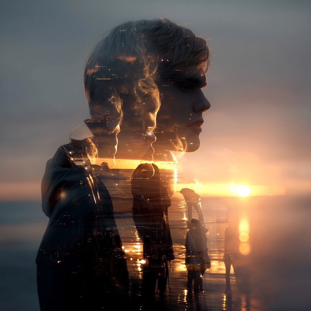 Создано на основе запроса: AVICII standing for a picture, but with young people’s faces transparent through him a sunset in the far distance