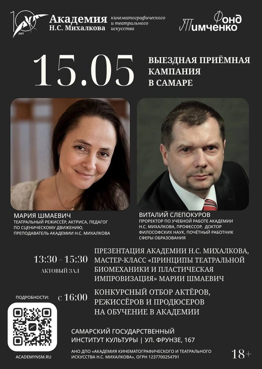 ЭТО ТВОЙ ШАНС! В четверг, 15 мая, на базе Самарского института культуры пройдёт отбор абитуриентов Академии кинематографического и театрального искусства Н.С. Михалкова. В рамках выездной приёмной кампании состоится отбор абитуриентов на бесплатное годичное обучение в актёрской, режиссёрской и продюсерской мастерских, в том числе на целевую подготовку. Расписание отборочного дня: ◽️ 13:30 – 15:30 – презентация деятельности Академии Н.С. Михалкова от Виталия Слепокурова и мастер-класс для начинающих актёров «Принципы театральной биомеханики и пластическая импровизация» от Марии Шмаевич. Участие бесплатное по предварительной регистрации ◽️ 16:00 – 18:00 – очный конкурсный отбор в формате собеседования. До него необходимо пройти заочный этап – электронная запись и анкетирование. К участию допускаются лица от 18 лет, имеющие высшее образование в области кинематографии и театрального искусства. Электронная запись на конкурсный отбор Анкету необходимо заполнить до 15 мая включительно