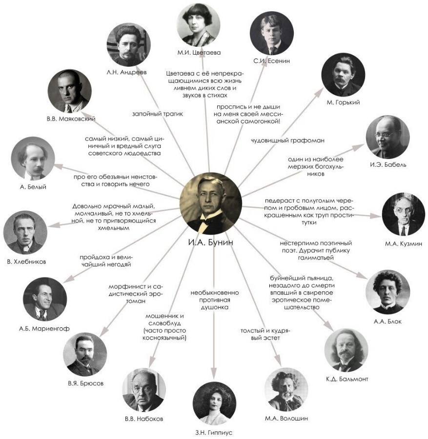 Иван Бунин часто критиковал других писателей и поэтов — признанных классиков и начинающих авторов. Некоторые высказывания Бунина о русских писателях: Однако некоторые произведения Бунин всё же хвалил, правда, делал это так редко, что адресаты положительных отзывов удивлялись или даже обижались. Например, Бунин отмечал, что Алексей Толстой очень талантлив, хотя и «часто городит чепуху как пьяный». Неоднократно Бунин брался за «Войну и мир» и «Анну Каренину» Льва Толстого, размышлял о том, как это написано и почему оказывает такой колоссальный эффект на читателя.