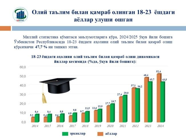 По состоянию на 2024/2025 учебный год в Узбекистане количество охваченных высшим образованием молодых людей, в возрасте от 18 до 23 лет, составило 47,7%. Отмечается, что данный показатель растёт из года в год. Среди этих процентных показателей, на протяжении последних трёх лет, лидируют женщины. Таким образом в текущем учебном году высшим учебным образованием охвачены 52,4% женщин и 43,5% мужчин. Стоит отметить, что ещё в 2021 учебном году доля мужчин составляла 29%, а женщин 27,4%.