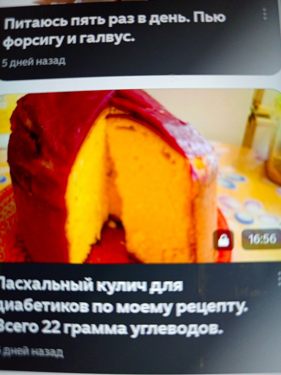 Хочу предложить Вашему вниманию рецепт моего пасхального кулича для диабетиков. Берем 3 яйца, разбиваем и хорошо взбиваем венчиком. Добавляем 250 граммов сметаны, разрыхлитель 1 упаковку, ванильный сахар 1 упаковку, сахарозаменителя 10 граммов. Разрыхлитель Пребио свит, в 20 раз слаще сахара. Все хорошо взбиваем венчиком. Затем добавляем 50 граммов растительного масла и 300 граммов миндальной муки. Все хорошо размешивают. Тесто должно получиться, как густая сметана. Выливаем в форму для кулича и вытекает в духовке при температуре 180 градусов 30 минут. Готовим глазурь. Для этого берем 100 граммов пюре, у меня сливовое, 5 граммов сахарозаменителя. У меня Пребио свит. Добавляем 5 граммов агар-агара. Размешивают и всю эту смесь кипятим 5 минут. Полученной глазурью обмазываем кулич. Всем приятного аппетита.
