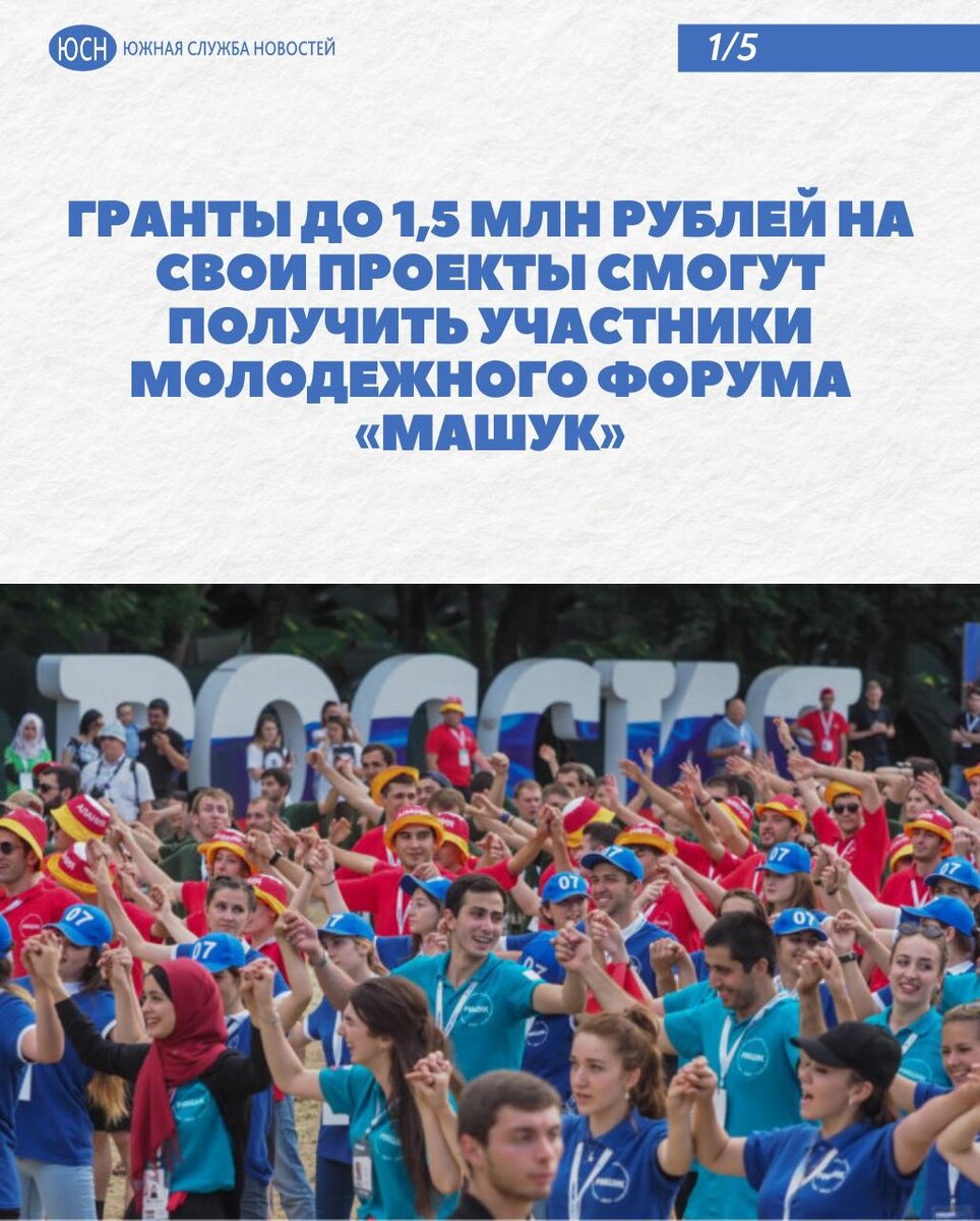 🔹 Гранты до 1,5 млн рублей на свои проекты смогут получить участники молодежного форума «Машук» В городе Пятигорске Ставропольского края 9 августа стартует XVI Всероссийский молодежный форум «Машук», который объединит 2200 участников 🌐 Южная служба новостей
