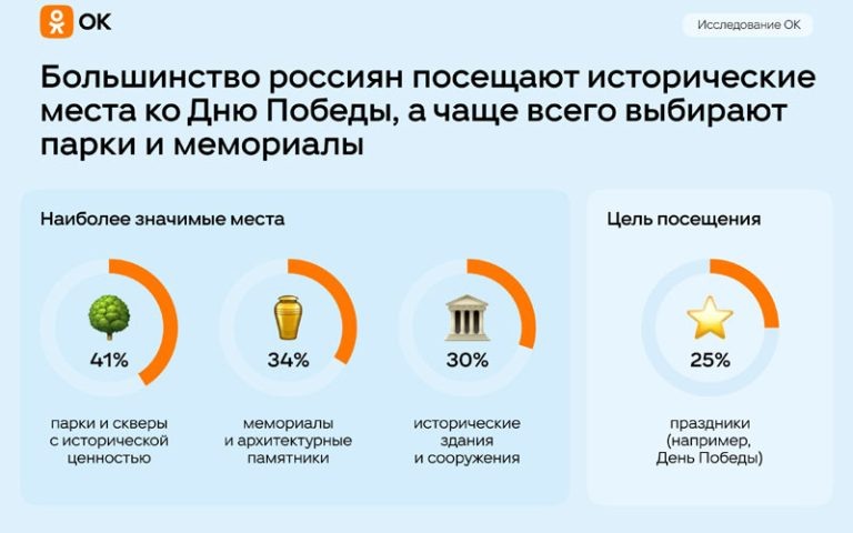 Социальная сеть Одноклассники провела исследование среди 7000 россиян из всех регионов страны и выяснила, как часто они посещают исторически значимые места и архитектурные памятники. По данным исследования, около трети респондентов несколько раз в год посещают исторически значимые объекты. Один раз в год это делают 38% опрошенных, а раз в несколько лет — 24%. Лишь 8% россиян посещают такие места крайне редко. Наиболее значимыми местами россияне назвали парки и скверы, имеющие историческую ценность (41%), далее следуют мемориалы и архитектурные памятники (34%), а также исторические здания и сооружения (30%). Исследование показало, что около 28% опрошенных посещают объекты из личного интереса для расширения кругозора, причем чаще всего это жители городов-миллионников. Еще 25% респондентов совершают там семейные прогулки. А праздники, такие как День Победы, становятся поводом для посещения у каждого четвертого россиянина. Почти половина опрошенных (49%) предпочитают посещать исторические