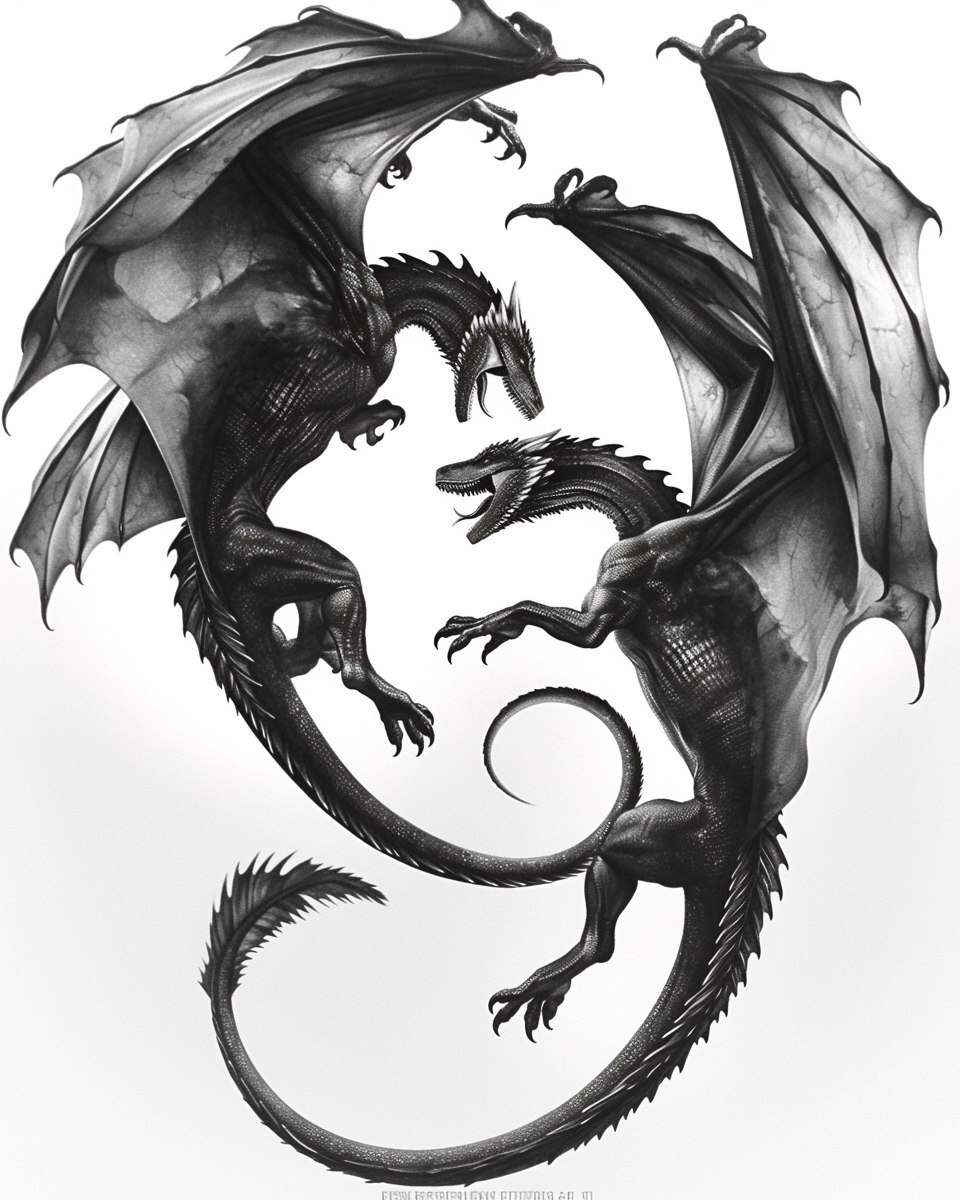 Автоперевод: Гиперреалистический дизайн татуировки двух драконов из Game of Thrones, преследующих друг друга вокруг полного изображения, черно-белого, белого фона, супер деталей, высоких деталей, без карандашей, артефактов JPEG, высокого качества, 4K, анатомических исправлений, резкого фокуса и сетчатки, HD, 1080p, 16K,