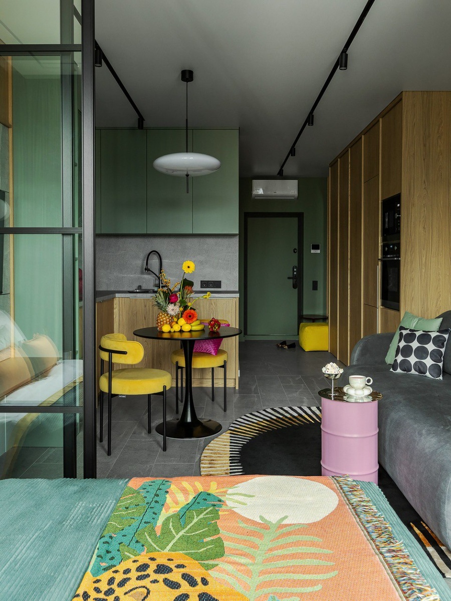 Студия 32 м² с удобной планировкой и смелыми цветовыми акцентами Заказчица проекта работает в IT-сфере. Она любит оригинальные решения и яркие краски. Девушка обратилась к дизайнеру Юлии Поздняк с просьбой оформить небольшую студию площадью 32 кв. м. Главным инструментом стал цвет. В качестве основы дизайнер использовала приятный оттенок зеленого эвкалипта и добавила к нему теплое дерево и нетривиальную текстуру камня. А при помощи текстиля, декора и картин «разукрасила» интерьер, внесла в него яркость и энергию. Тут больше фото и все подробности: https://www.inmyroom.ru/posts/40623 #студия #интерьер
