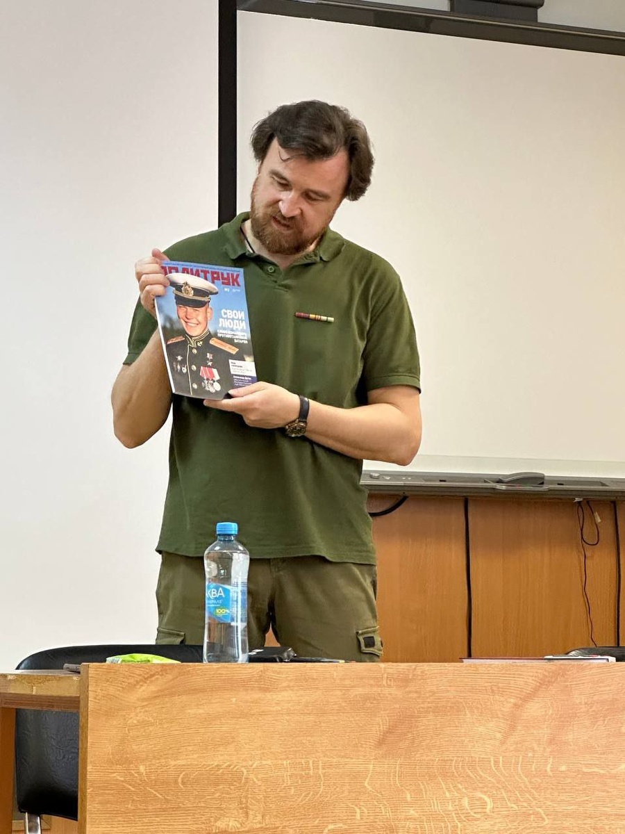 Вчера выступил перед студентами МГУ, в Военном учебном центре университета. Рассказал будущим лейтенантам запаса о журнале ГВПУ ВС РФ "Политрук" и наших проектах: Всероссийском конкурсе студенческих эссе "1418 слов о герое", Всероссийском видеопроекте "Пушкинский полк", компьютерной игре "Отряд 22". Представил свою книгу"Бранная слава" и апрельский выпуск"Роман-газеты" с моими новыми военными повестями и рассказами. Как всегда были вопросы. Умные. Про СВО, Сирию, будущий путь развития России. Говорили начистоту.