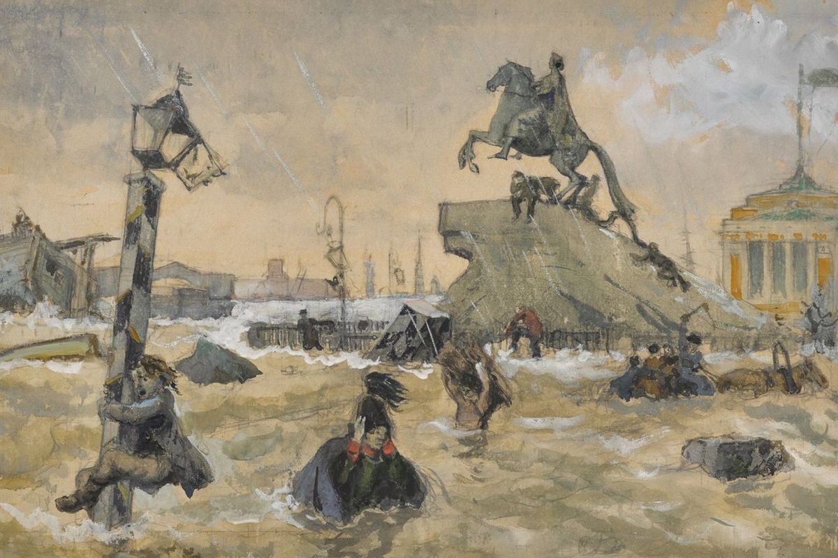 Нева изображается как одушевлённая сила — она рвётся к морю, борется с бурей, но не может её одолеть. Река вздувается, ревёт, клубится и, словно разъярённый зверь, бросается на город. Эта картина наполнена драматизмом и напряжением: Петрополь сравнивается с мифическим тритоном, наполовину погружённым в воду, что придаёт сцене почти апокалиптический масштаб. Волны ведут себя как злые и коварные существа — они «лезут в окна, как воры», а лодки, неуправляемо мчаясь, разбивают стёкла своими кормами. Всё это создаёт ощущение катастрофы, в которой привычный порядок рушится под натиском неукротимой природы. Однако за этой живописной и пугающей сценой скрывается и более глубокий смысл. Наводнение у Пушкина — это не просто природное бедствие, а символический акт возмездия природы городу, построенному вопреки естественным условиям, на зыбкой, болотистой земле.