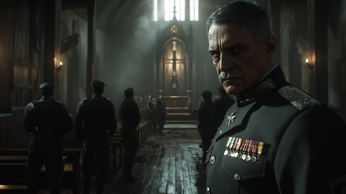 Создано на основе запроса: Inside a dimly lit, decrepit military chapel at dawn, a group of armed soldiers in fatigued uniforms stand frozen
